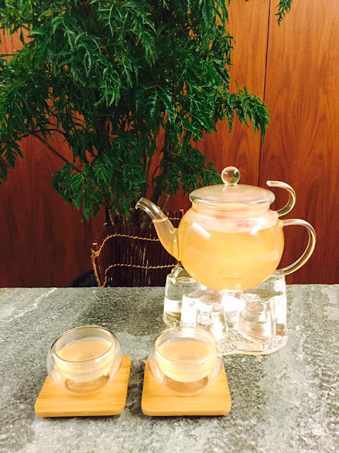 取二瓣梨肉,置玻璃茶壺內膽中,加入些許白木耳、枸杞子。淋下梨湯,置暖火上,送席。