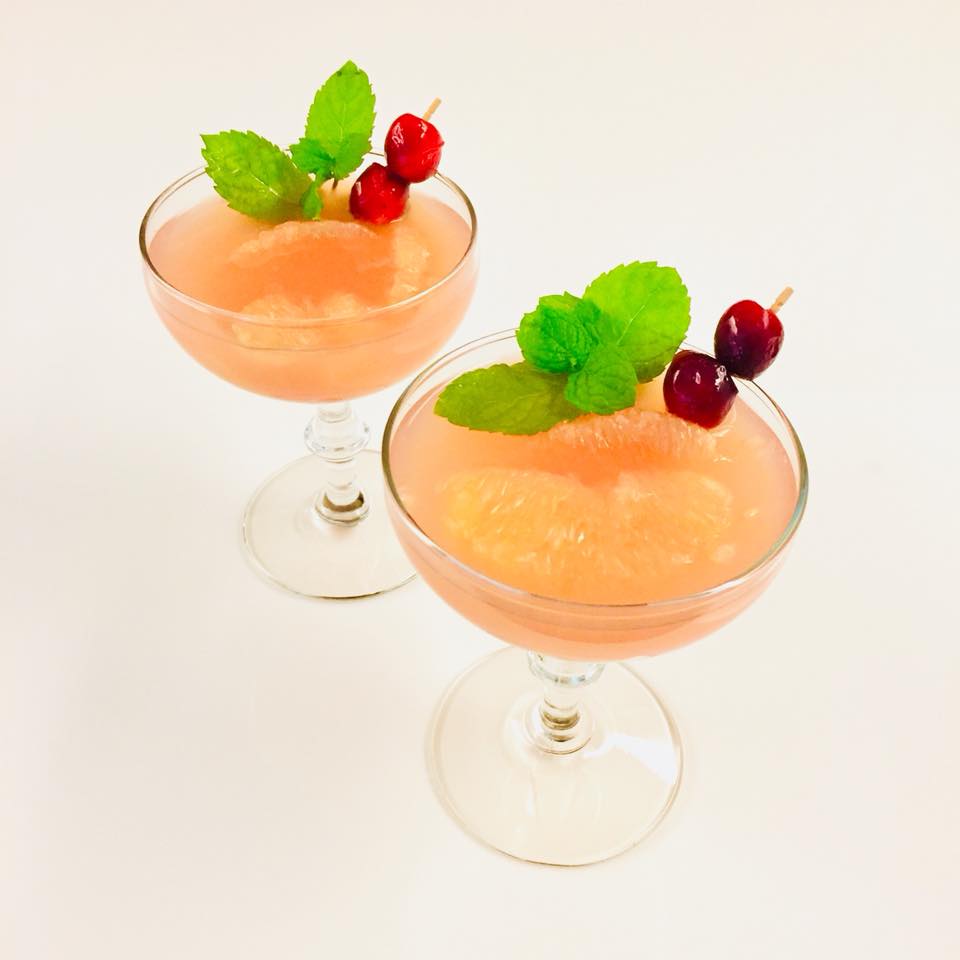 葡萄柚汁盛入杯中,蔓越莓糖漿以針筒「注射」至杯底。加入葡萄柚果肉。以小籤串起糖汁蔓越莓,插在果肉上,飾以薄荷葉尖。